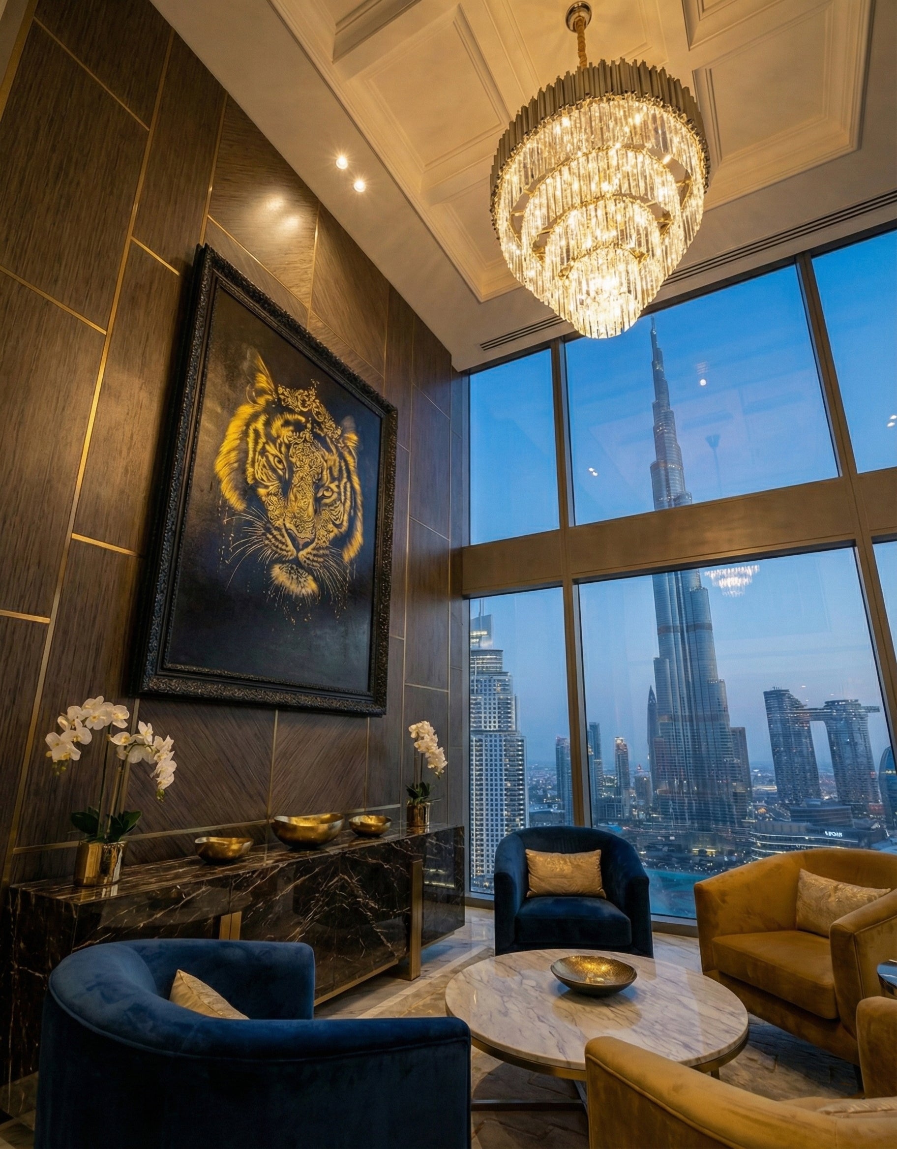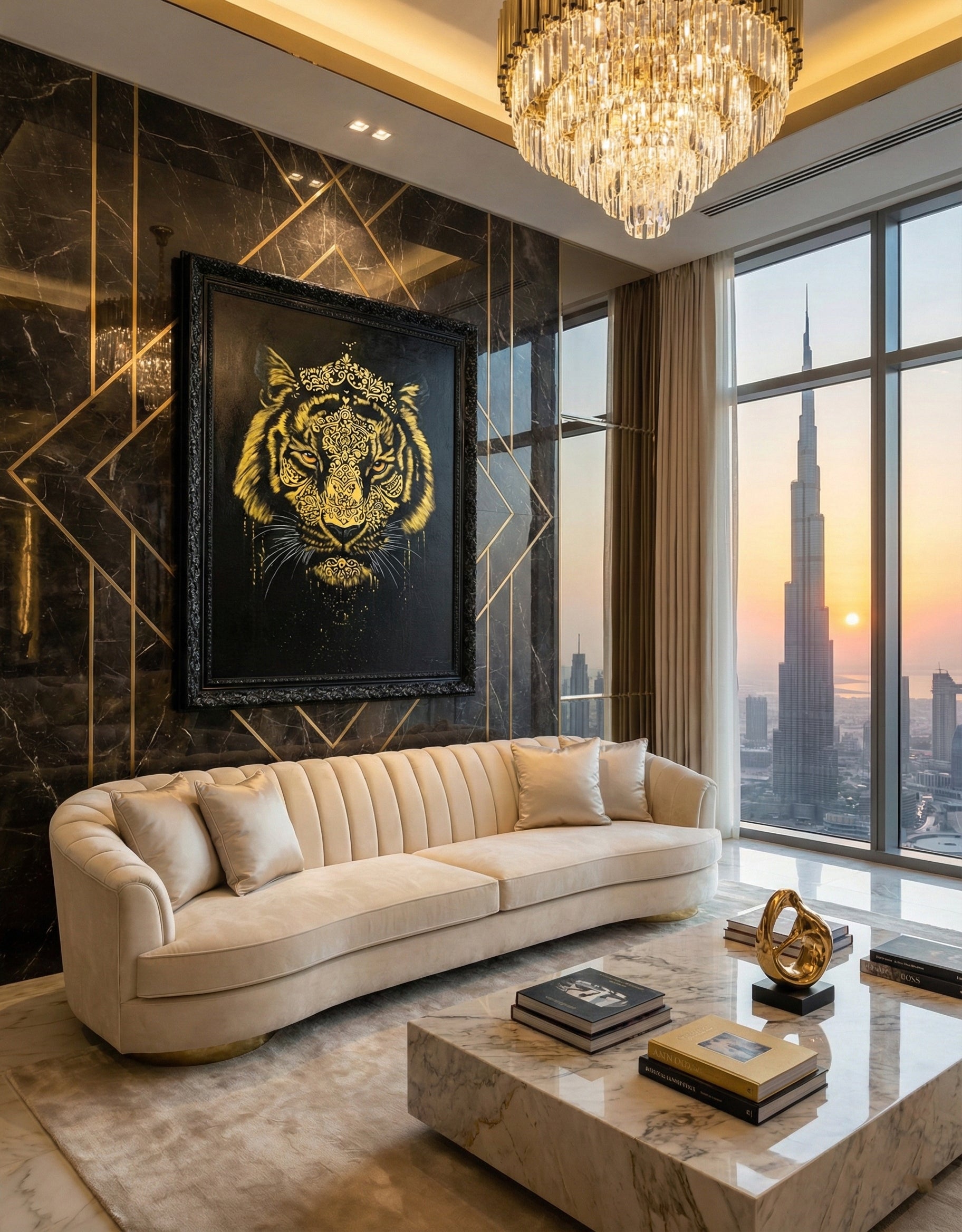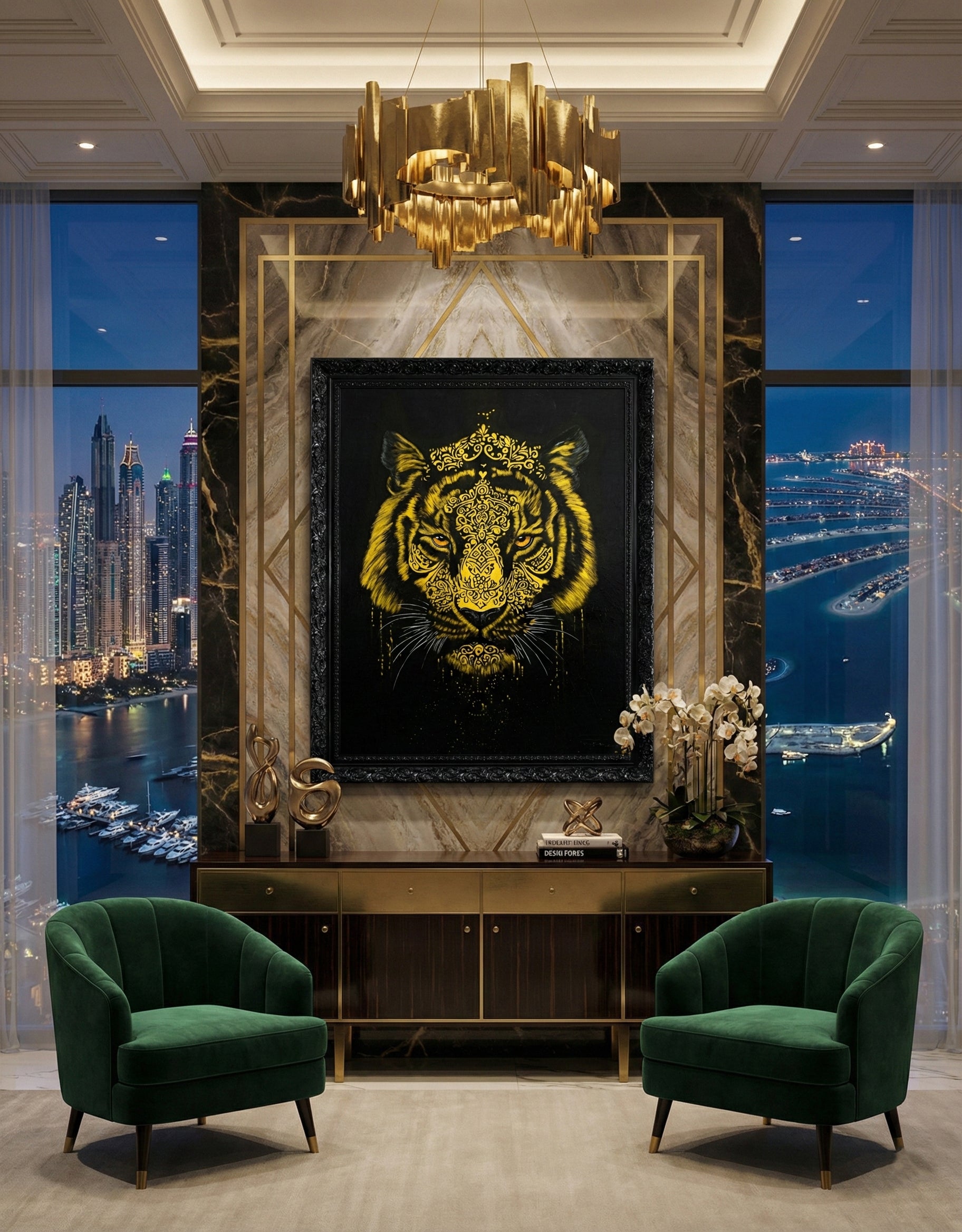 Original acrylic with golden lacquer and natural pigments on canvas, 122 x 91 cm (48 x 36 in), framed in ornate lacquered black wood, 1/1 signed, created by artist Maurice Figué. A sacred statement piece blending Hindu symbolism and golden elegance, designed for luxury living rooms, hotel lobbies, and executive offices in Dubai, Abu Dhabi, Riyadh, and beyond.