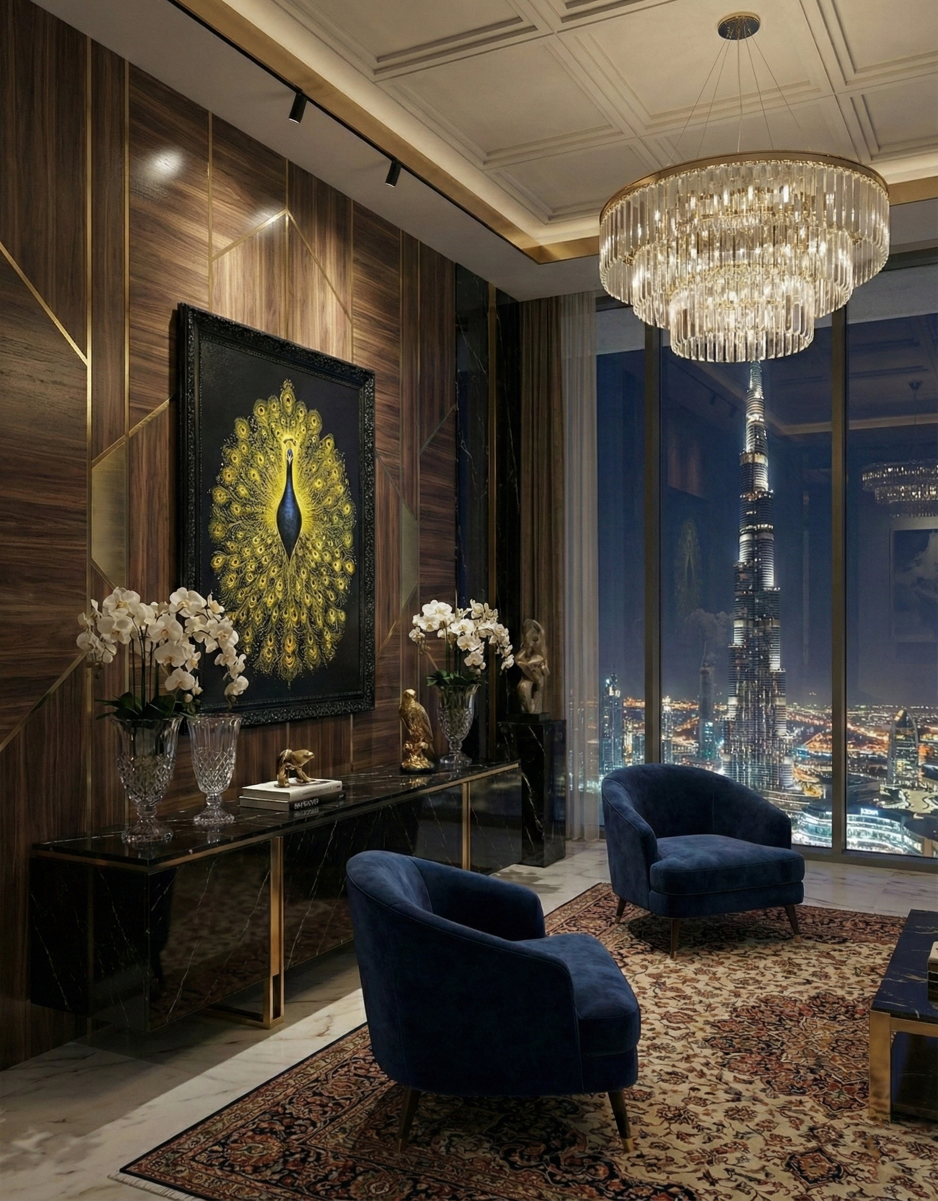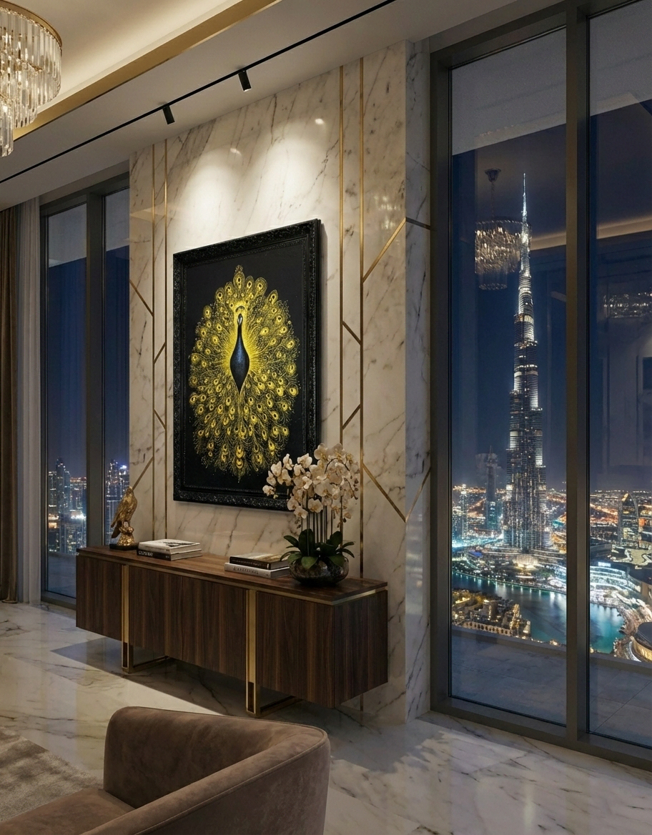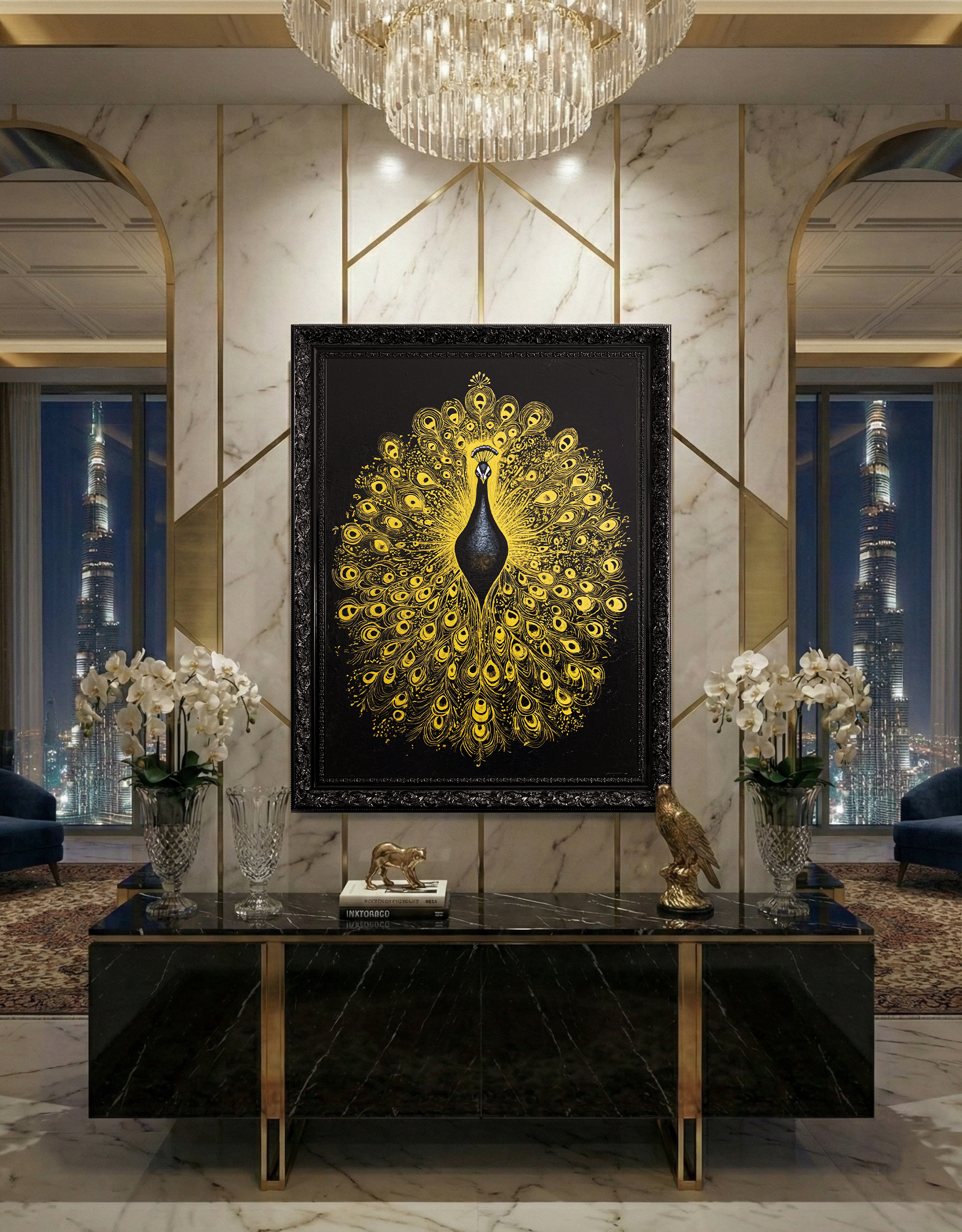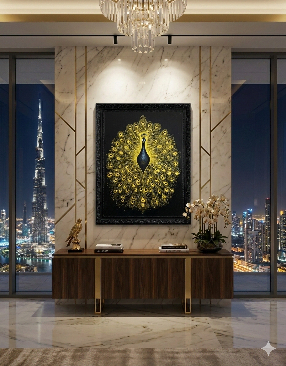 Original acrylic with golden lacquer and natural pigments on canvas, 122 x 91 cm (48 x 36 in), framed in ornate lacquered black wood, 1/1 signed, created by artist Maurice Figué. A sacred statement piece blending Hindu symbolism and golden elegance, designed for luxury living rooms, hotel lobbies, and executive offices in Dubai, Abu Dhabi, Riyadh, and beyond.