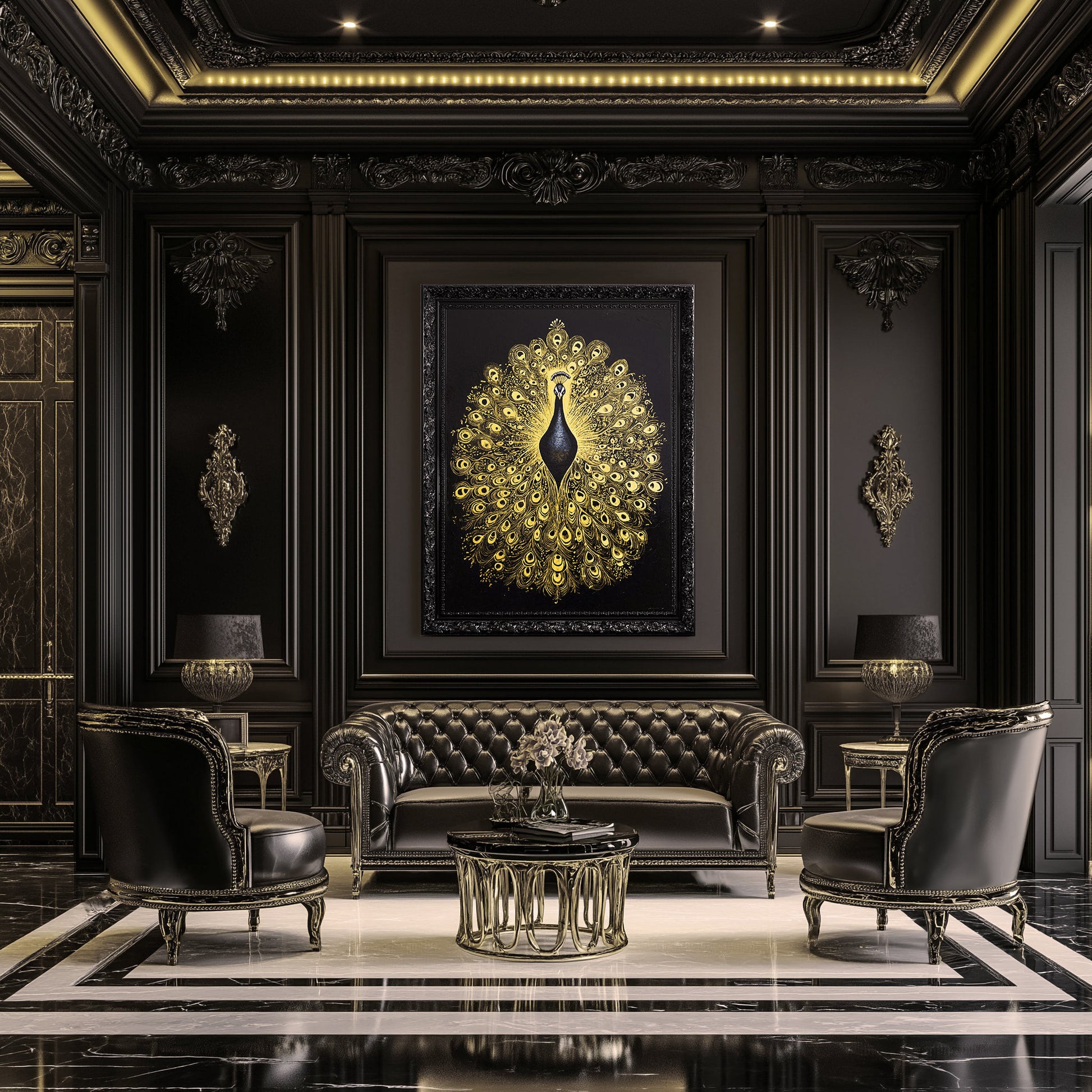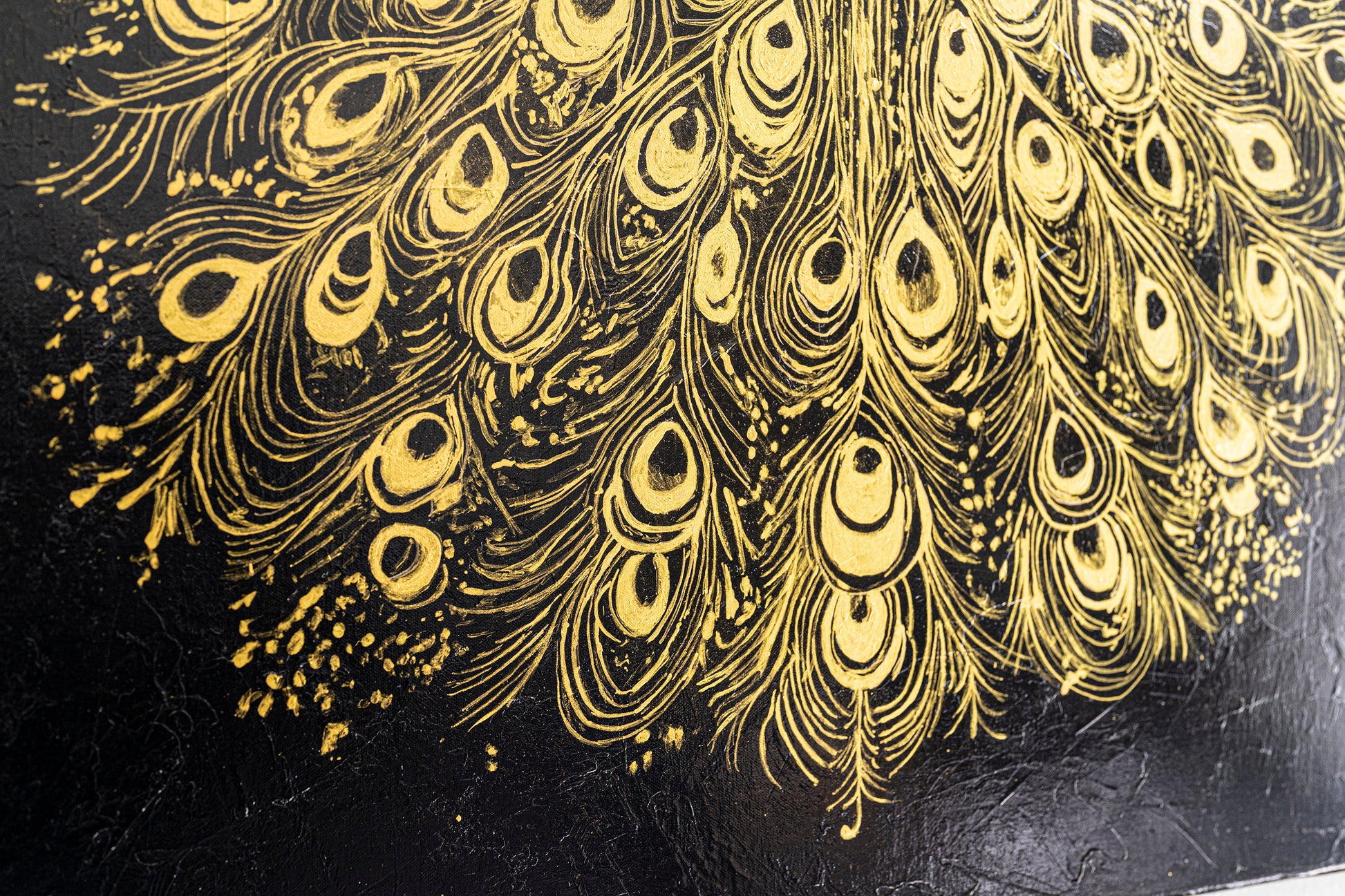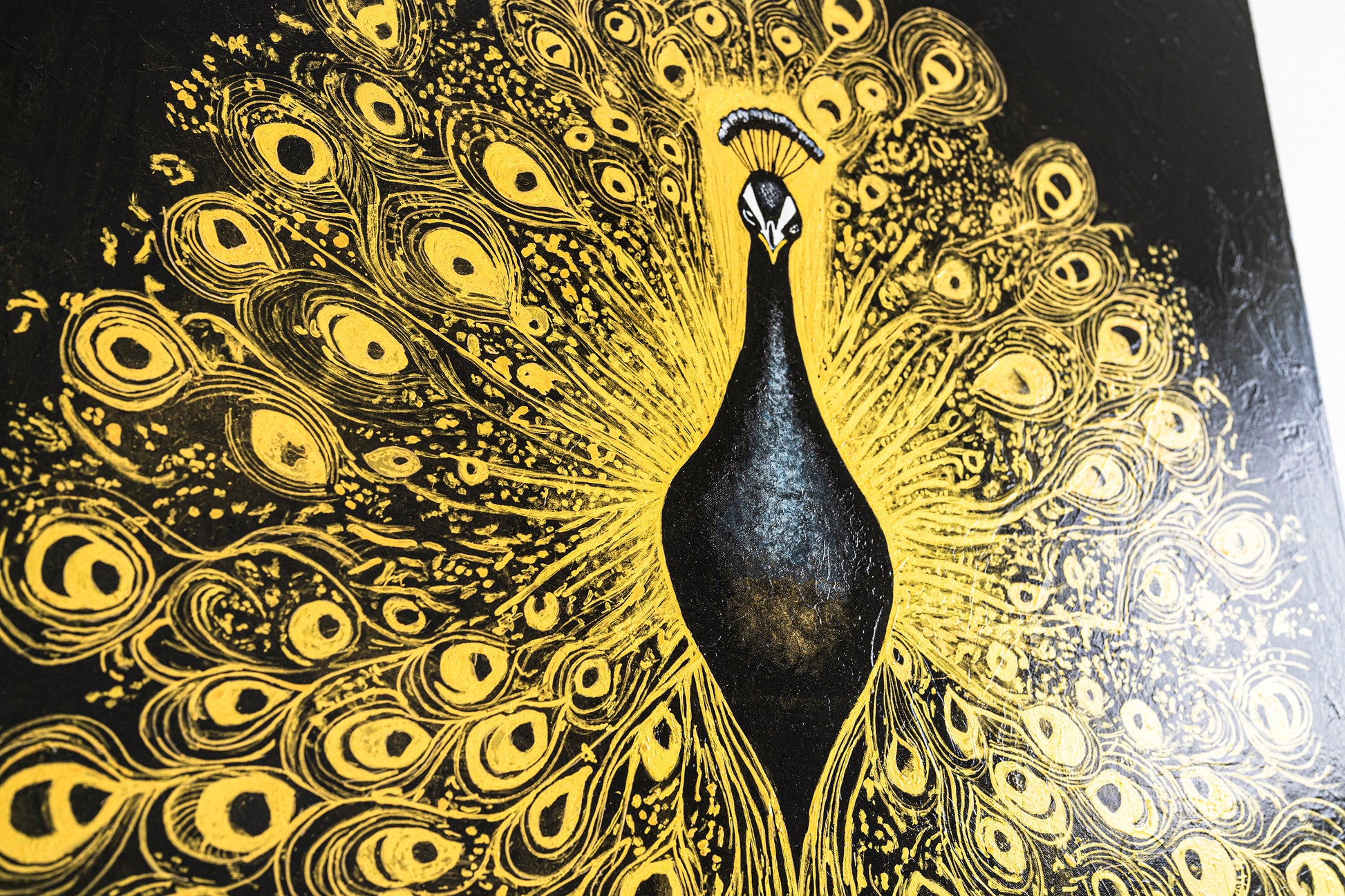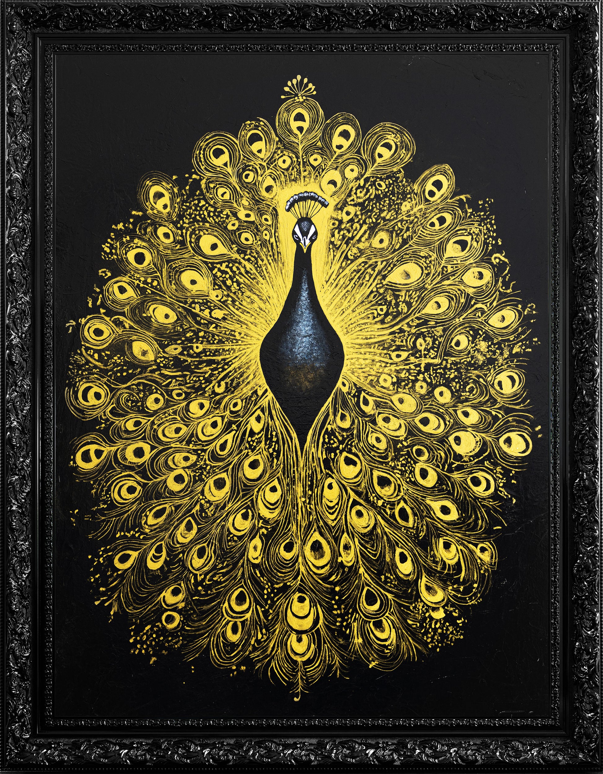 King of Feathers is an original hand-painted artwork by Angie & Maurice Figué, designed to capture the timeless elegance and symbolic power of the peacock.