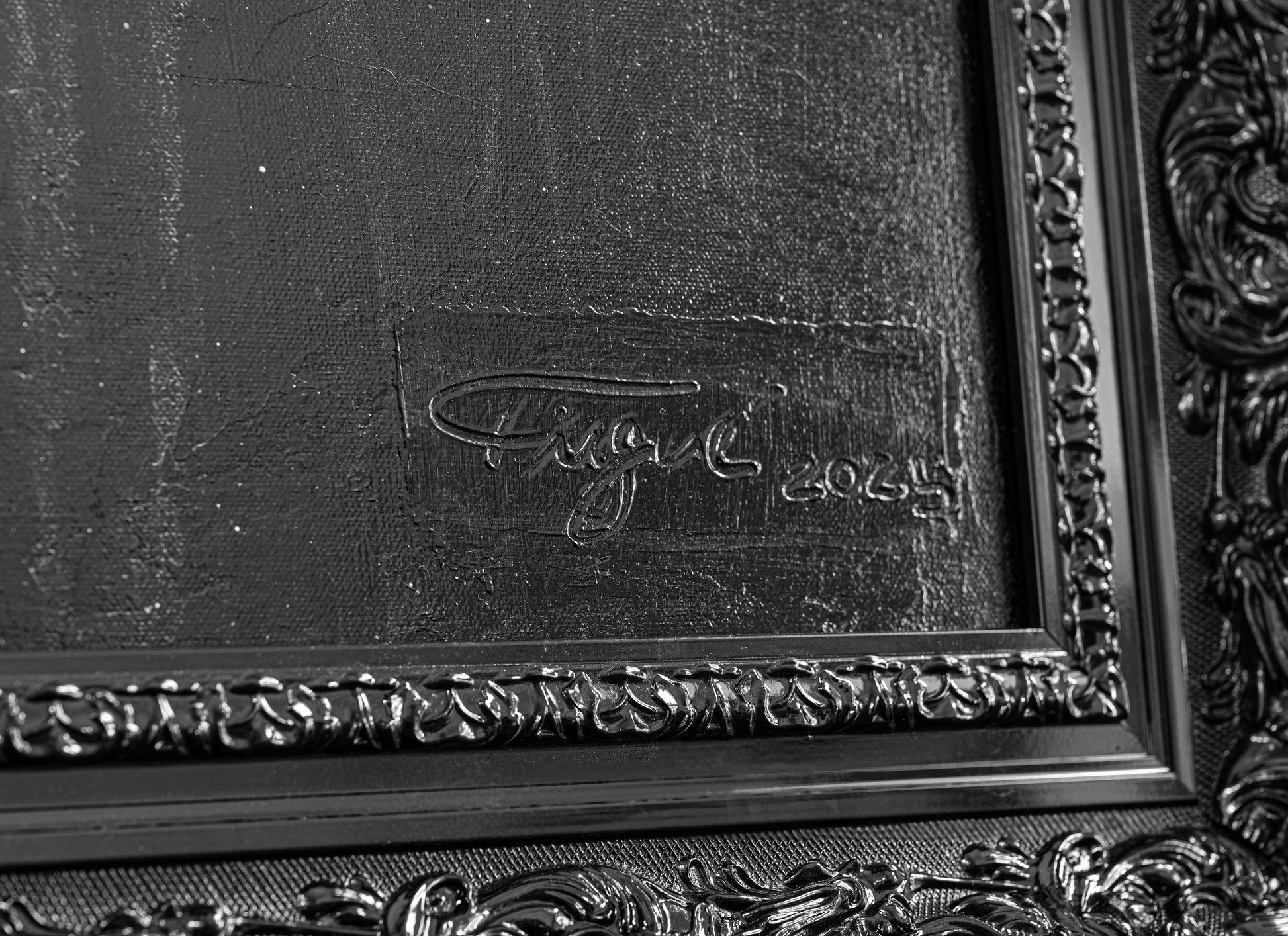 - Black ornamental frame, ready to hang